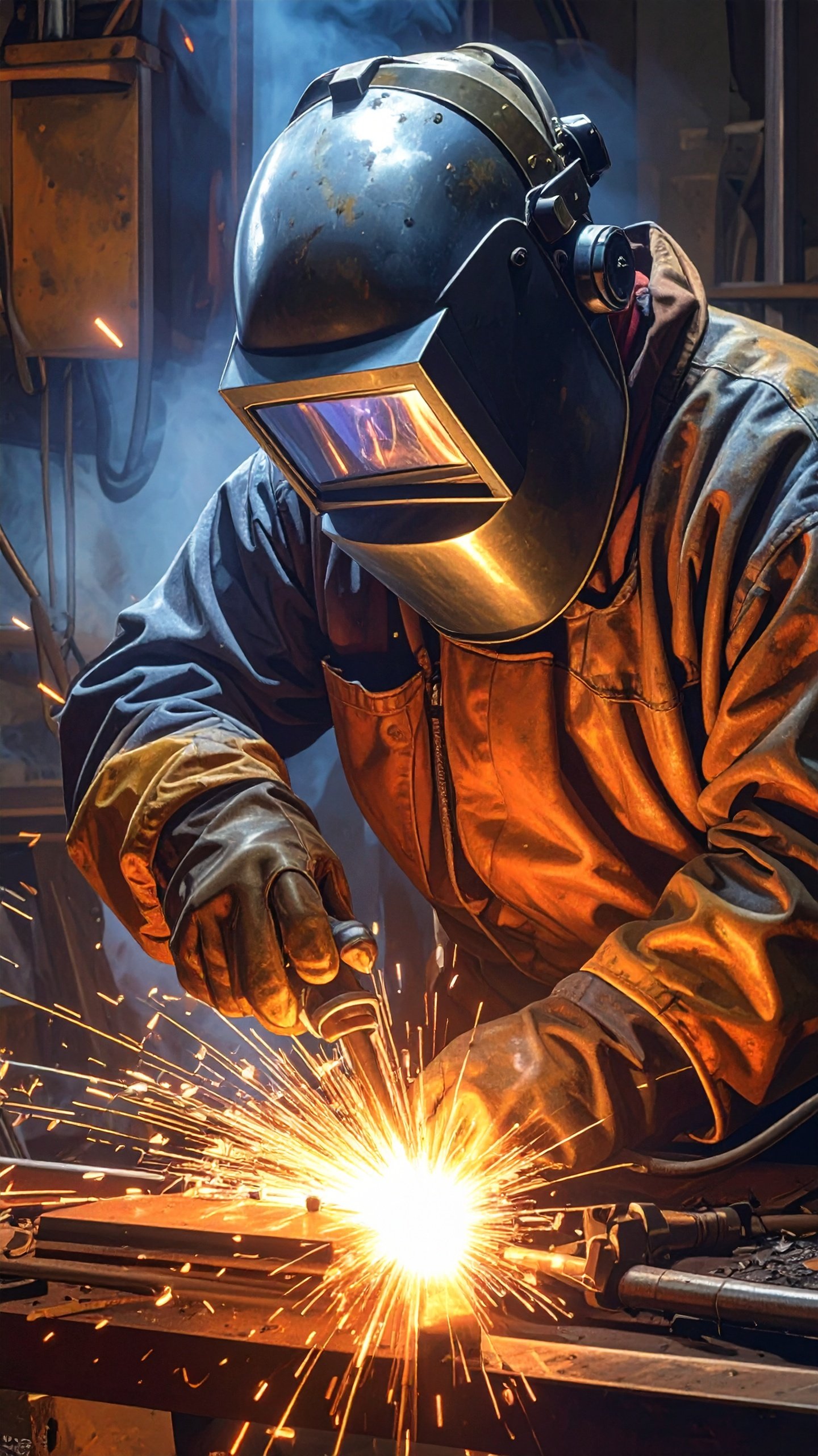 Male welder wearing construction gloves and welding mask hardworking and welding with welding machine metal in workshop. Worker in furniture factory grinding metal.